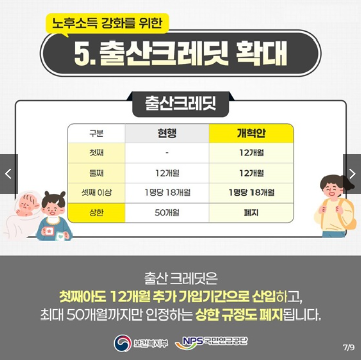 출산 크레딧은 자녀를 출산한 국민에게 추가 가입기간을 인정하여 노후소득을 보장하는 제도입니다. 현재는 둘째 자녀부터 적용되며, 최대 50개월까지만 인정하는 제한이 있었으나, 이번 개편을 통해 첫째 자녀도 12개월의 추가 가입기간을 인정받게 되며, 기존의 상한 규정도 폐지됩니다.