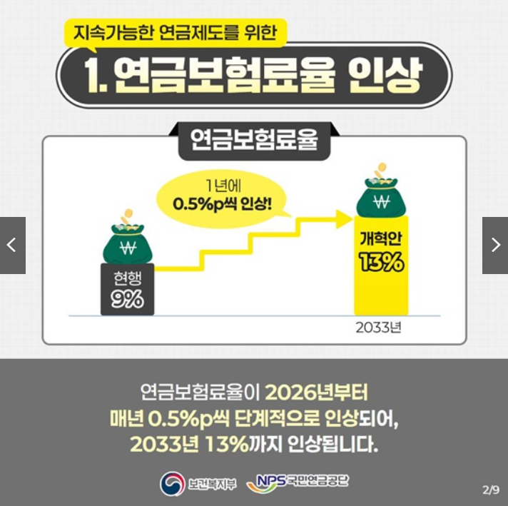 2026년부터 국민연금 율은 매년 0.5%포인트씩 단계적으로 인상되며, 2033년에는 13%까지 오르게 됩니다. 즉, 현재 소득의 9%를 납부하고 있는 가입자는 2026년에는 9.5%, 2027년에는 10%를 내는 식으로 점진적으로 증가하게 됩니다. 이러한 조치는 국민들에게 한 번에 큰 부담을 주지 않으면서도, 장기적으로 연금 재정을 안정화하기 위한 방안입니다.