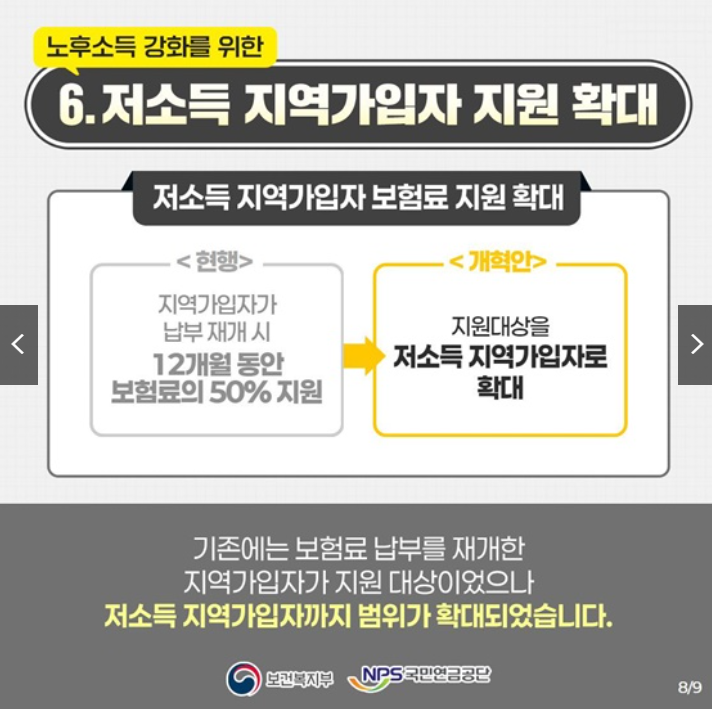 이번 개편에서는 저소득 지역가입자에 대한 지원이 더욱 강화됩니다. 기존에는 국민연금 보엄료 납부를 재개한 지역가입자만 지원을 받을 수 있었지만, 앞으로는 저소득층 지역가입자도 지원 대상에 포함됩니다.