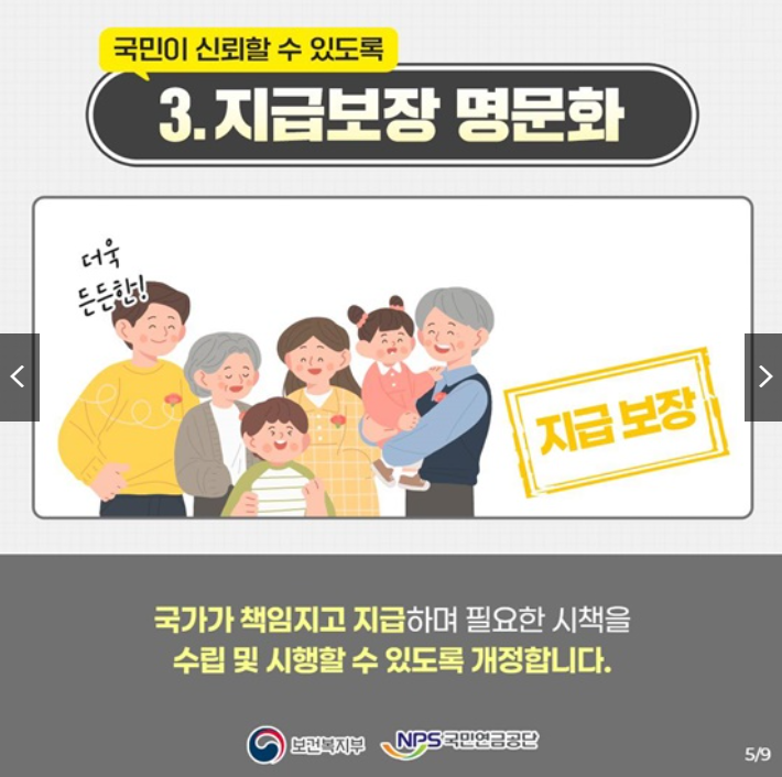 또한 이번 개정에서는 국민연금 지급을 국가가 책임지고 보장한다는 내용을 법률에 명확히 규정하였습니다. 기존에도 국민연금은 국가가 운영하는 공적 연금제도였지만, 법적으로 명확한 지급보장 조항이 없어 일부 국민들 사이에서 연금 지급에 대한 불안감이 존재했습니다. 이에 따라 정부는 "국가는 국민연금의 지급을 책임진다"는 내용을 법률에 명시하여 국민연금이 안정적으로 운영될 것임을 보장하고 있습니다.